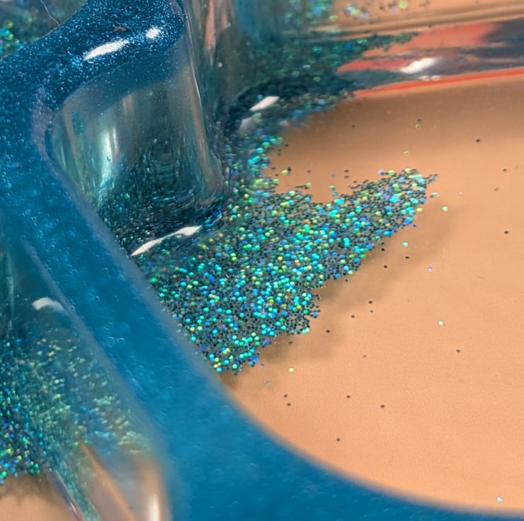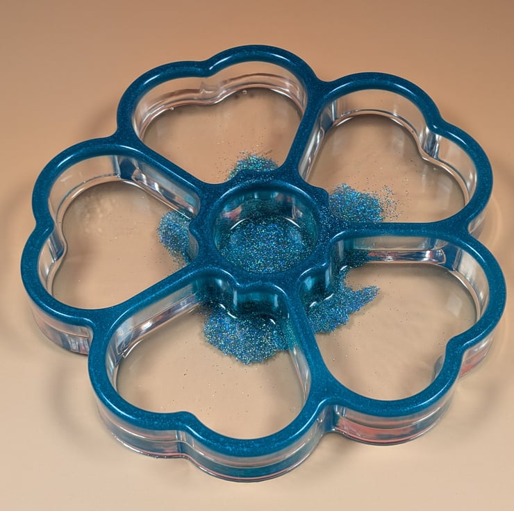 Looking for a quirky, eye-catching way to store jewellery, keys, or trinkets? This handmade resin tray features five heart-shaped petals arranged in a daisy-style flower design, with a clear base and shimmering teal petals. The centre and part of the base are filled with turquoise holographic glitter, adding a beautiful shimmering effect as colours shift with the light.