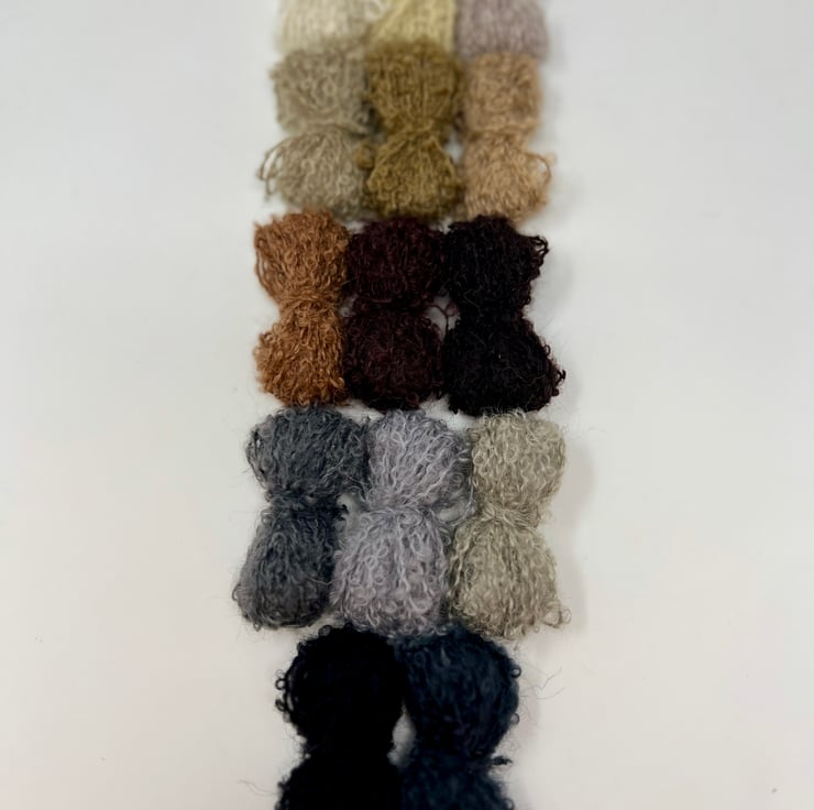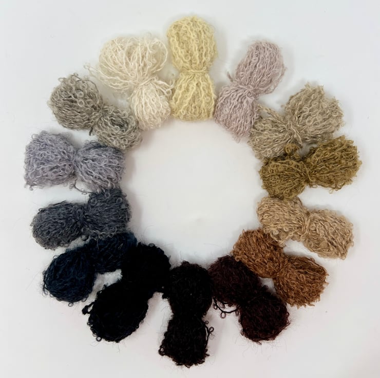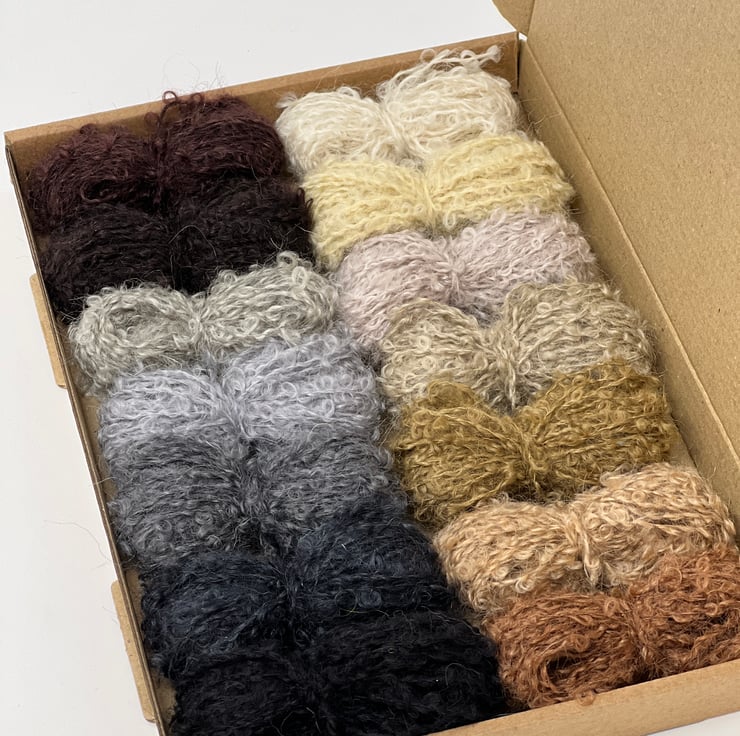 Neutral-coloured selection pack of 14 mohair boucle/loop wool yarns, perfect for incorporating into your wet felting projects, including felting on a ball. These yarns are different to the ones included in my main yarn selection pack of 28 yarns (see separate listing).