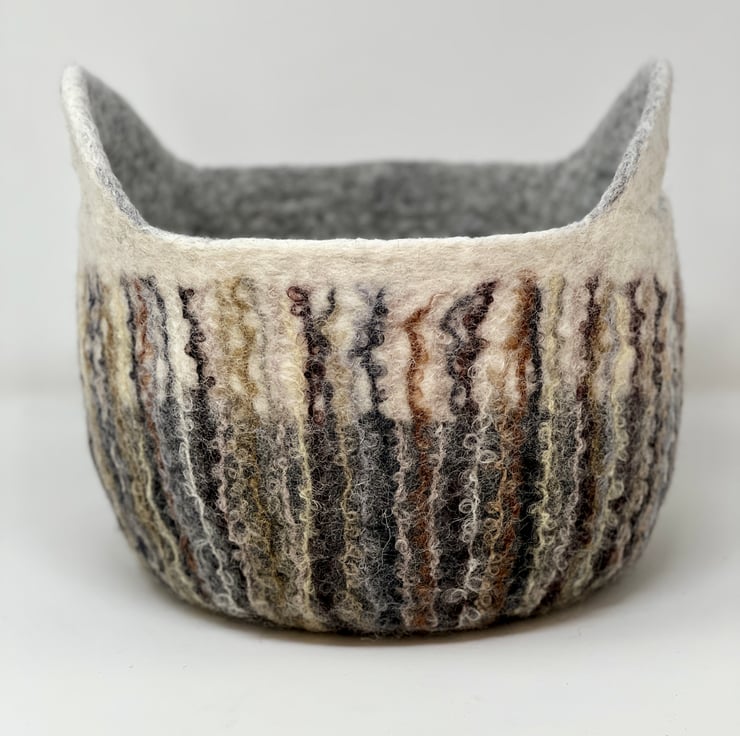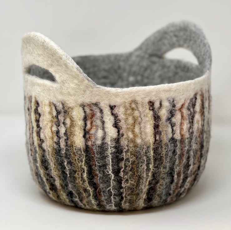 This pack contains 14 different yarns in a neutral selection of colours (ranging from white, grey to black and beige to brown, please see photos), 10m of each yarn, to give you 140m of yarn in total with a combined weight of approximately 75g. The yarns are all mohair boucle/loop wool, either 100% wool or a very high wool content, perfect for incorporating into your wet felting projects. See the final photos for an example of a felt basket on a ball using all 14 yarns.