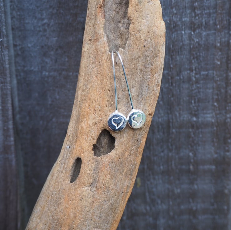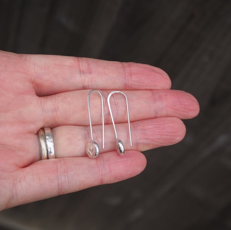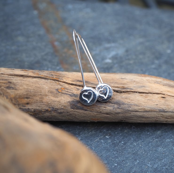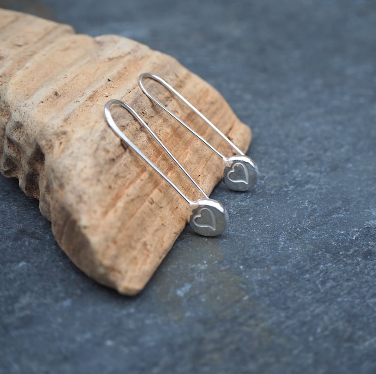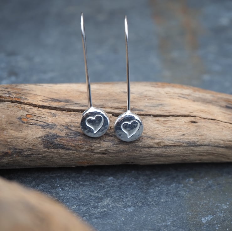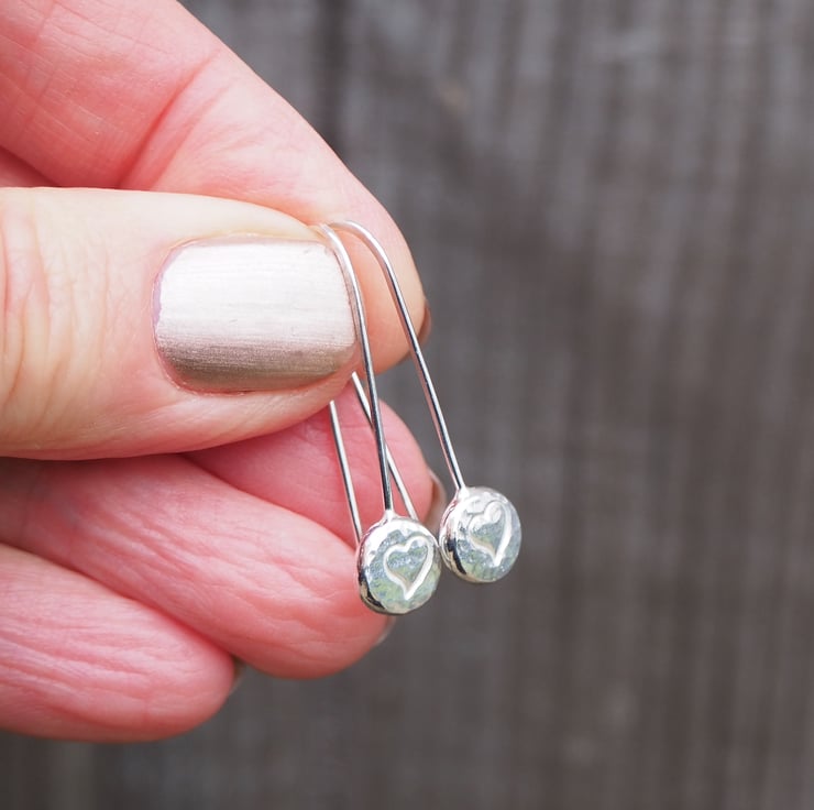These handmade silver pebble drop earrings are great for everyday wear. They feature a little heart punched into the silver. I have lightly hammered the silver to give it a bit of extra sparkle.