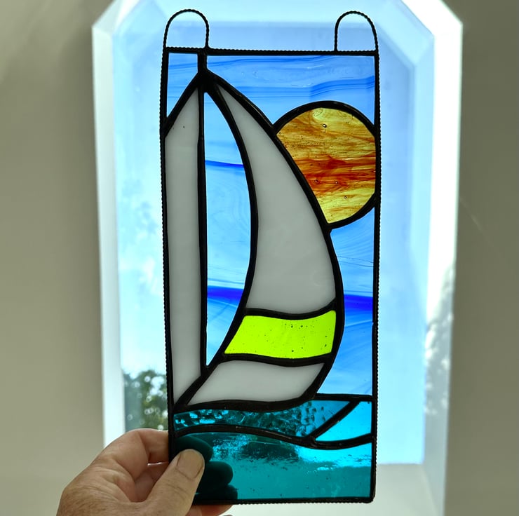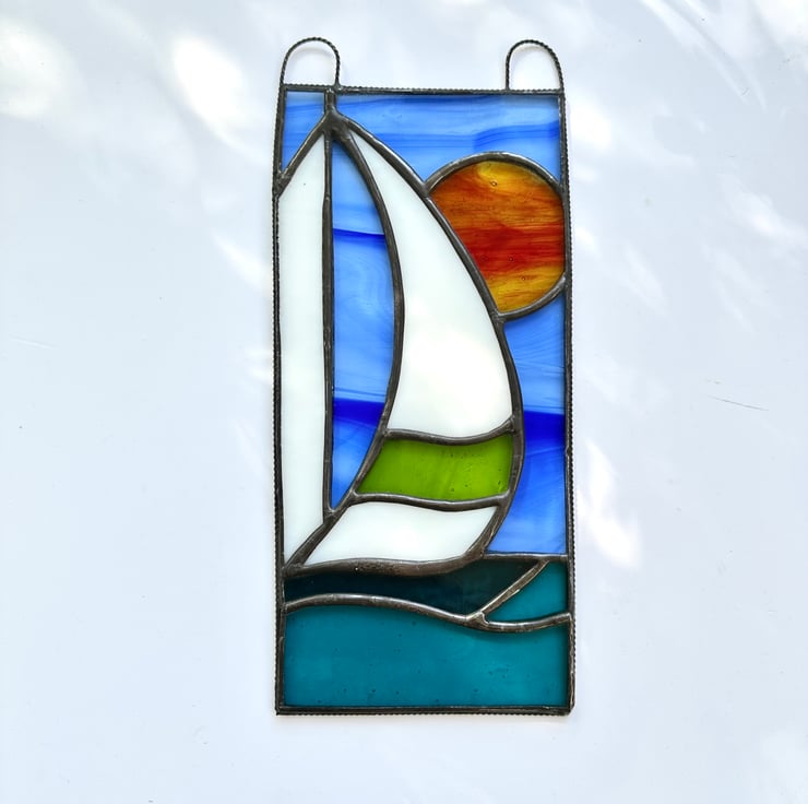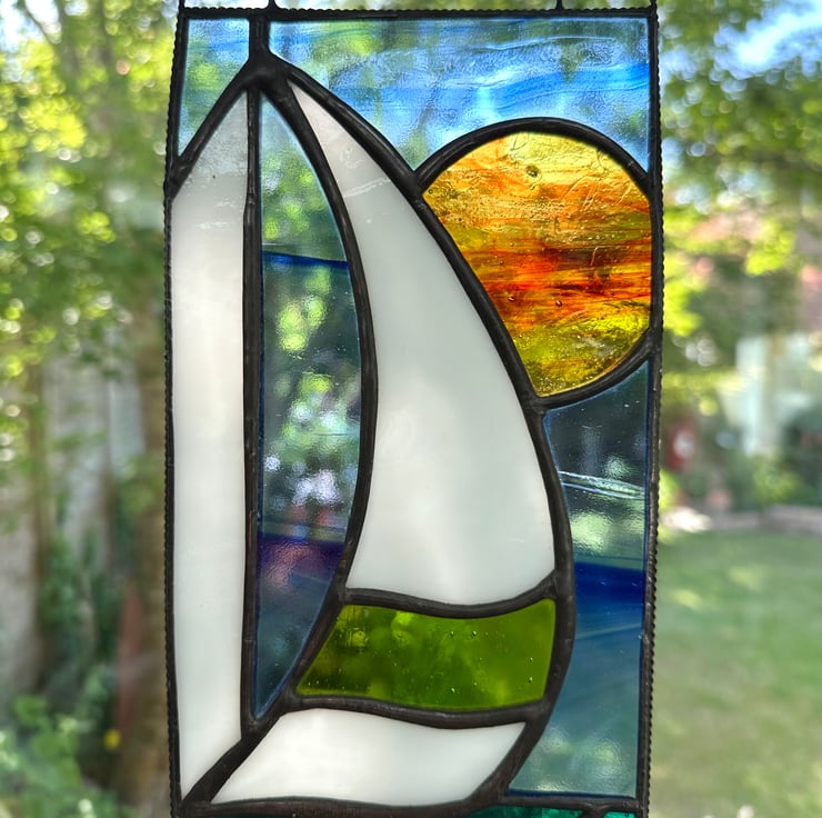 Each piece of glass has been hand cut, ground, washed, copper foiled and solder together to form a beautiful picture of a sailing boat before being washed again, a patina applied to blacken the solder, washed again and polished, I have added a decorative boarder made of twisted wire which not only looks attractive but adds strength and also forms the hanging hooks. A length of fishing line has been attached for hanging purposes.
