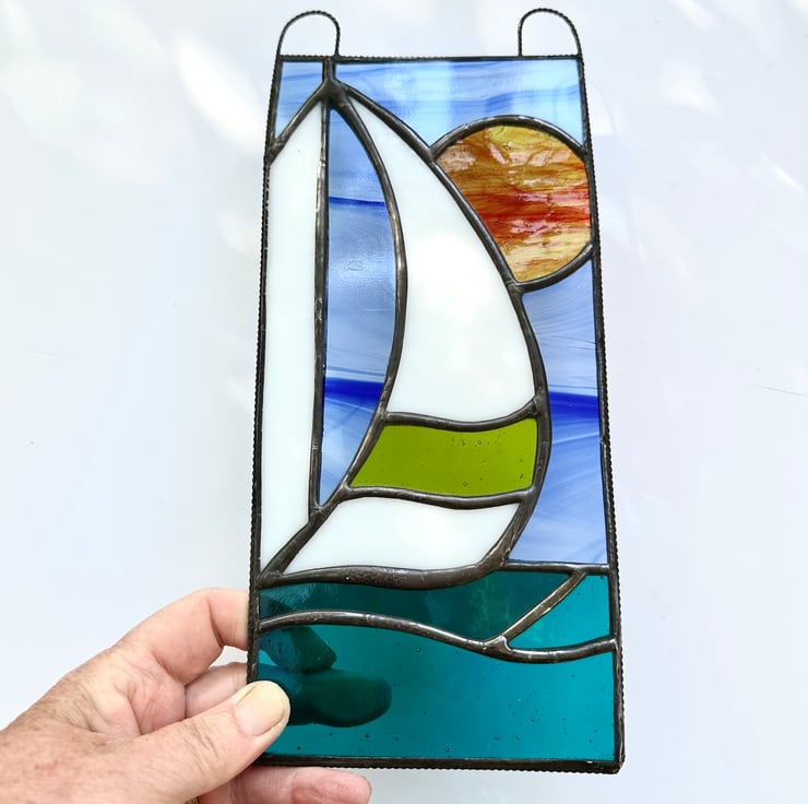 Sail boat suncatcher handmade in beautiful stained glass by Carole's Glass.