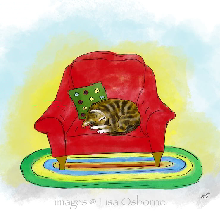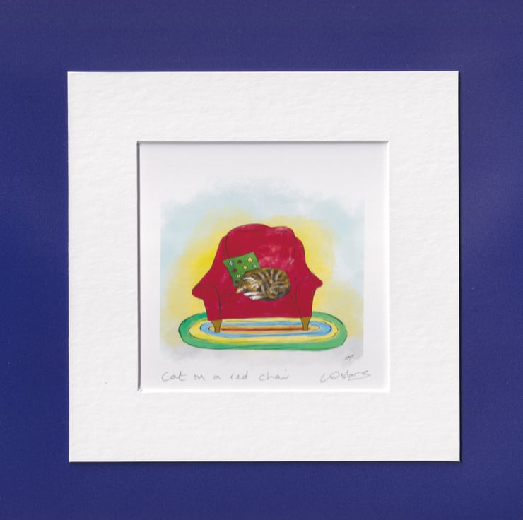 Cat on a red chair - high quality signed and titled, open edition print, with mount, from one of my illustrations of these popular pets.