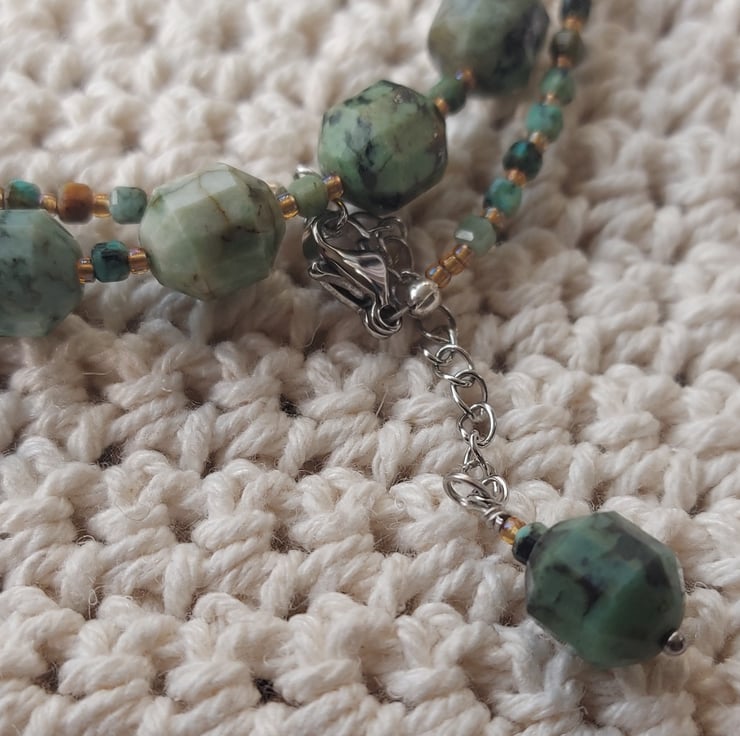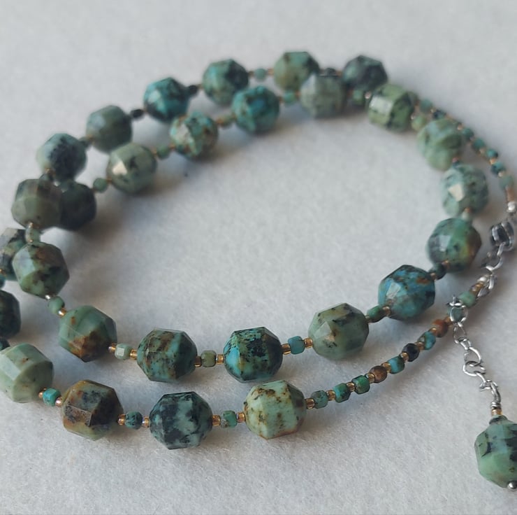 African Turquoise pointed barrel beads make up the majority of this stunning necklace. Between each 8 x 6mm bead are small cubes of the same gemstone and size 15° seed beads. This necklace is 17-19" long, due to an extender chain. This is a lovely wear all year round.
