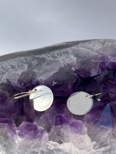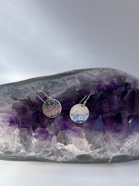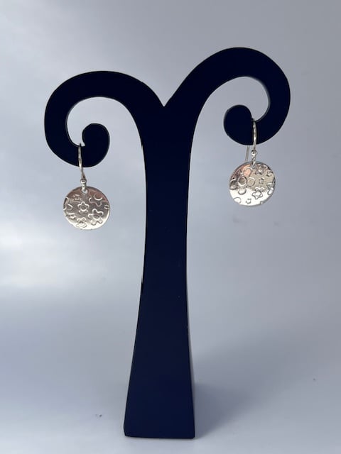 Round earrings with a flower texture. 12mm disc and 23 mm drop ( including wires)