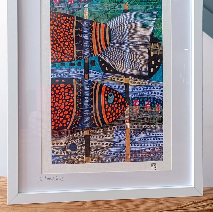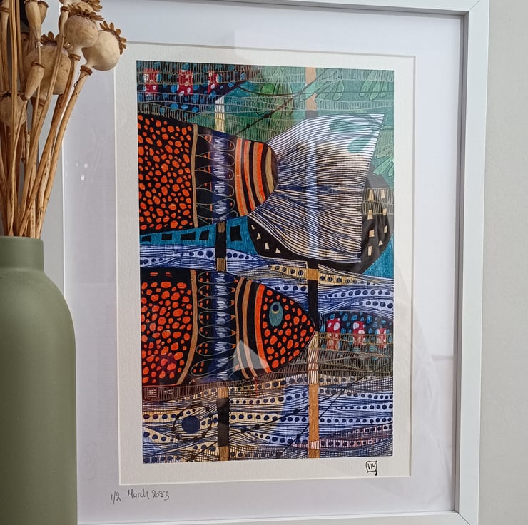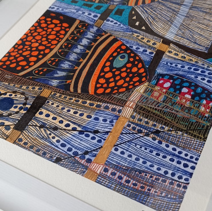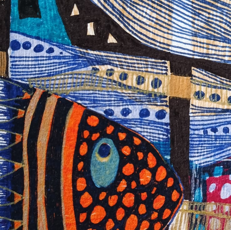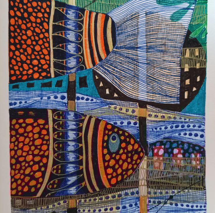 A colorful and bold ink illustration artwork that features vibrant and intricate depictions of fish created using a combination of colorful inks and various techniques to achieve a visually striking and detailed design