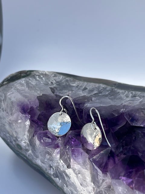Silver dome earrings with a light hammered texture. Measures approximately 15 x 15 mm. The earring drop is 24 mm ( including wire).