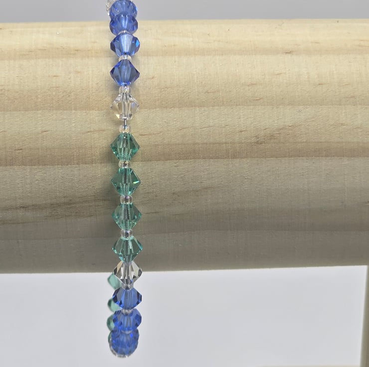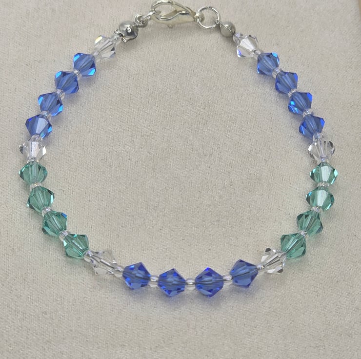The bracelet has been made using preciosa bicone glass beads, in the colours Caribbean Sea, Sapphire and clear crystal. The coloured sections are divided using the clear crystal beads. The beads are on a thin beading wire and fastens with a metal clasp at the back.
