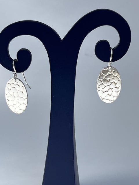 Silver earrings with a pebble texture. Disc measures approximately 20 x 12 mm. The earring drop is 27 mm ( including wire).