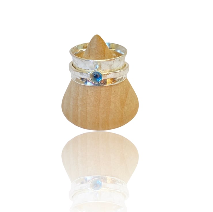 This beautiful handmade spinner ring also known as a spinner ring is made with 10mm wide Sterling silver band. featuring q 4mm topaz gemstone. The rustic handmade texture of the recycled silver is enhanced with an elegant spinner design to create a timeless piece you canter for any occasion. You can also customise the ring by replacing the topaz with your favourite gemstone.