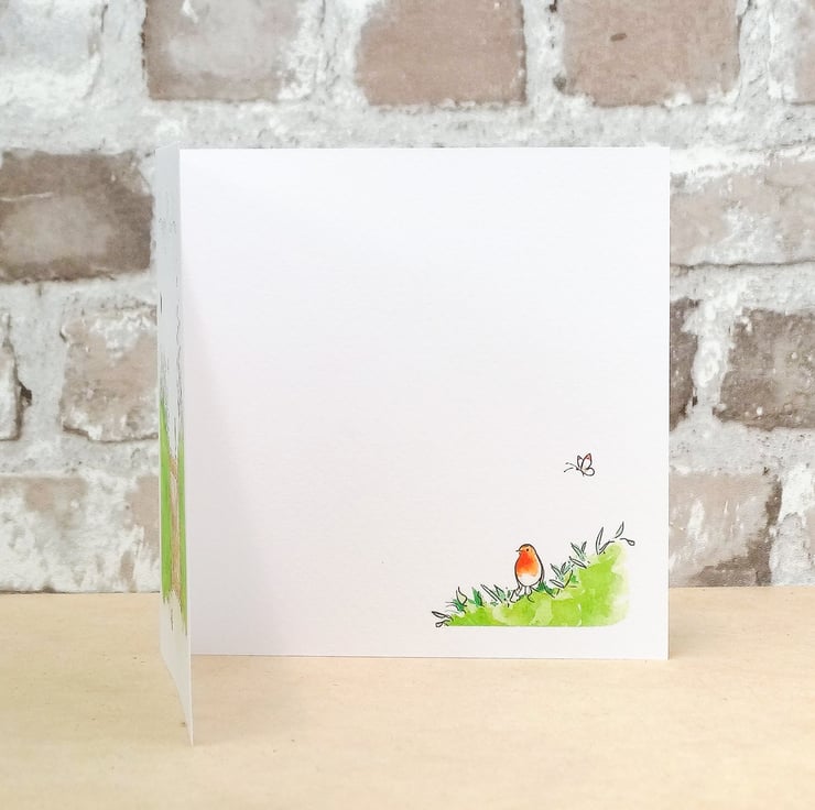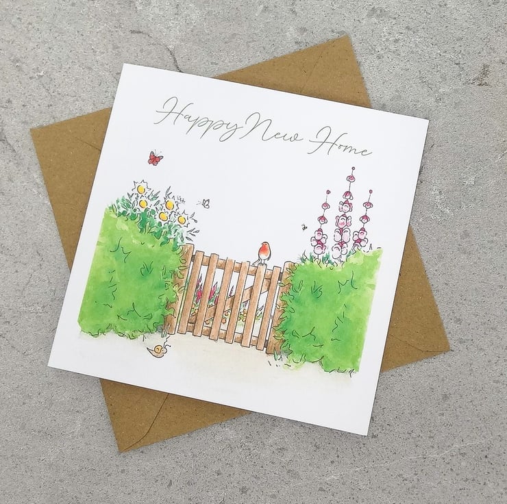 This New Home card Garden Gate has been printed with my original artwork on 'New' white texture FSC approved 280gsm card and comes with a brown kraft envelope protected in a clear biodegradable bag.