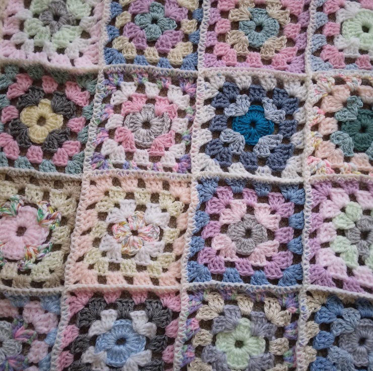 Crochet granny squares blanket handmade in pale pastel colours. Perfect for a baby blanket or a lap blanket. Measures approx 38 ins (97 cm) x 28 ins (71 cm).