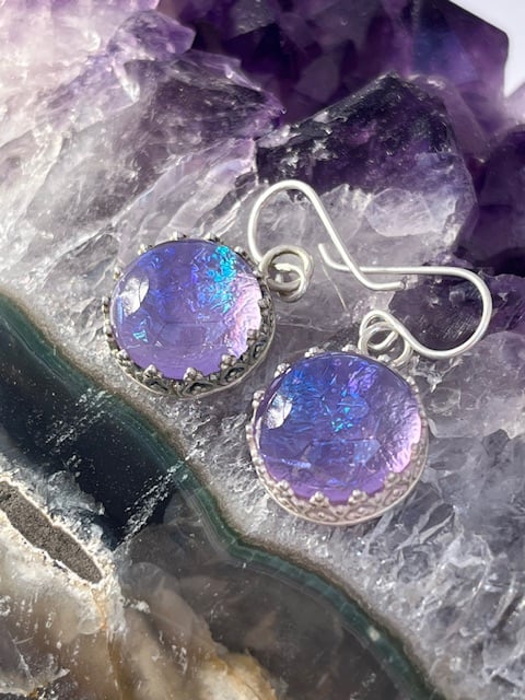 Silver earrings with a hand made fused glass cabochon stone. Transparent stone with some sparkle in pink/mauve/blue - depending on the light and direction you view it.