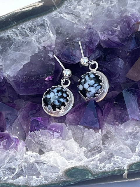 Silver earrings with a hand made black and white fused glass cabochon stone. The back of the earrings is textured with a bubble pattern.
