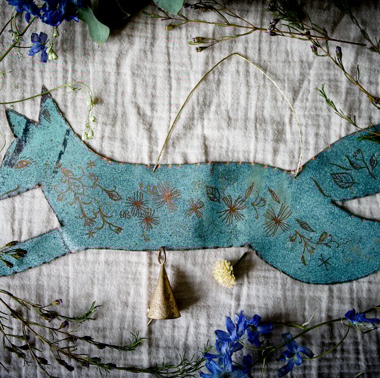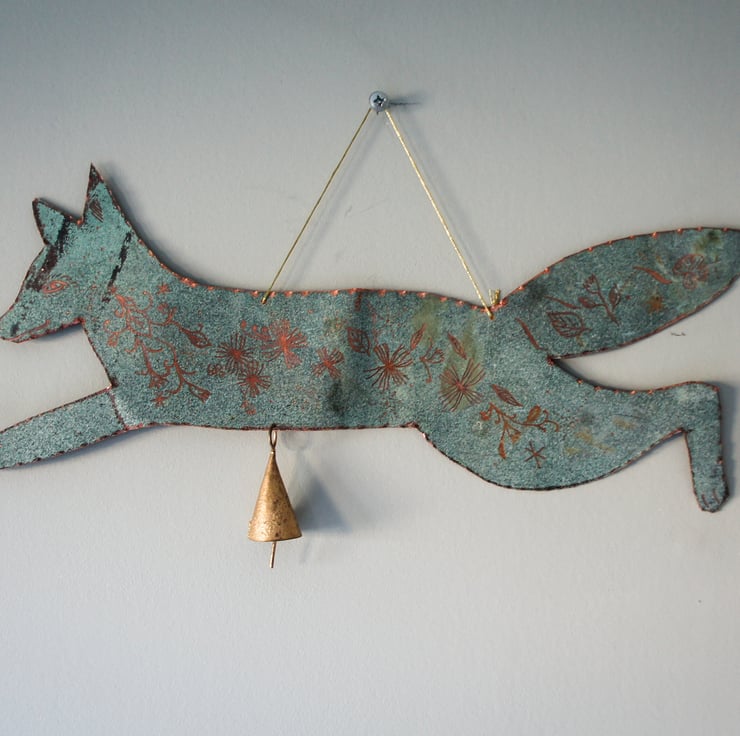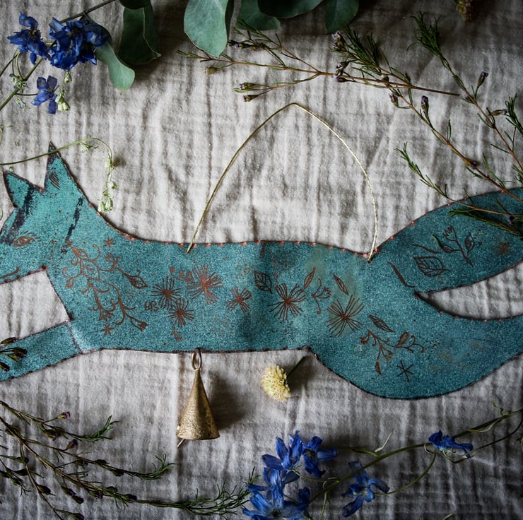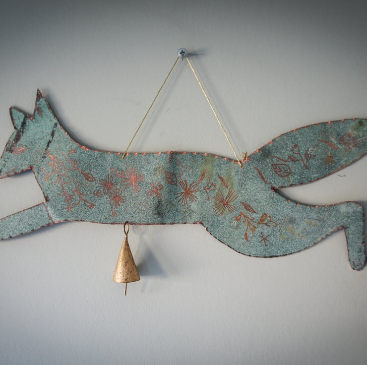 A hand-cut, hand engraved one of a kind copper fox sculpture.