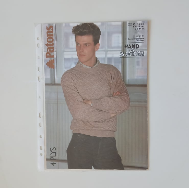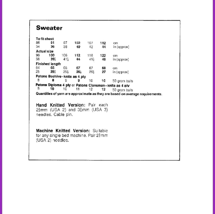 This hand knit PATTERN is for a man's sweater. To fit chest: 86 to 112 cm or 34 to 44 inches. Knitted in 4 ply yarn using 2.75 mm and 3.5 mm knitting needles. There is also a machine knit version included with this pattern.