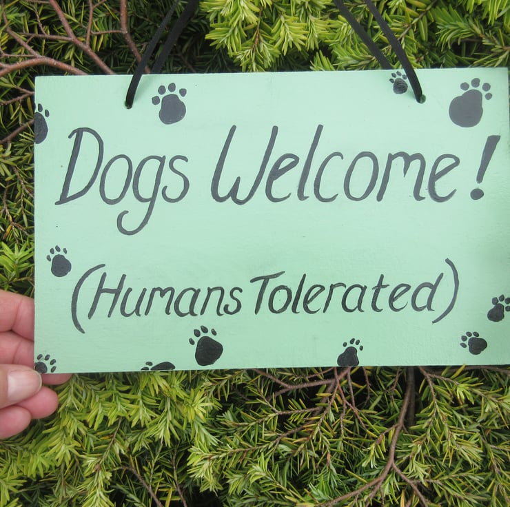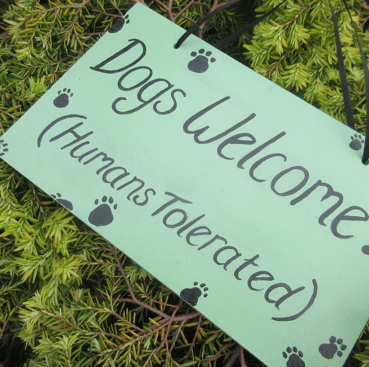 An MDF sign, well sealed with outdoor varnish, with a sage green background, , and the text 'Dogs Welcome (Humans Tolerated)'.