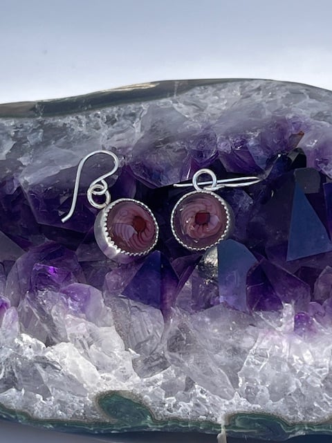 Silver earrings with a handmade pink fused glass cabochon stone with flower design.