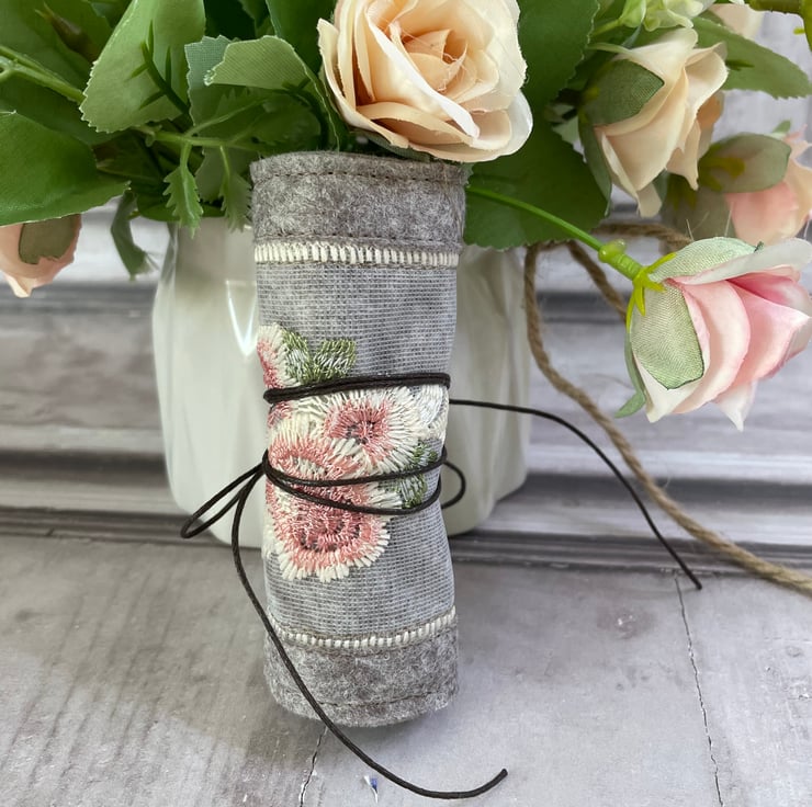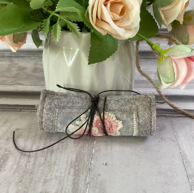 A needle roll case, to keep your needles safe. Made from 100% wool felt. Cut out displaying a pretty lace design. Tied with a waxed cord.