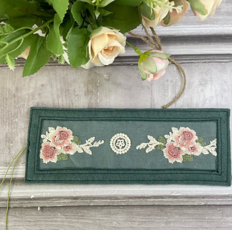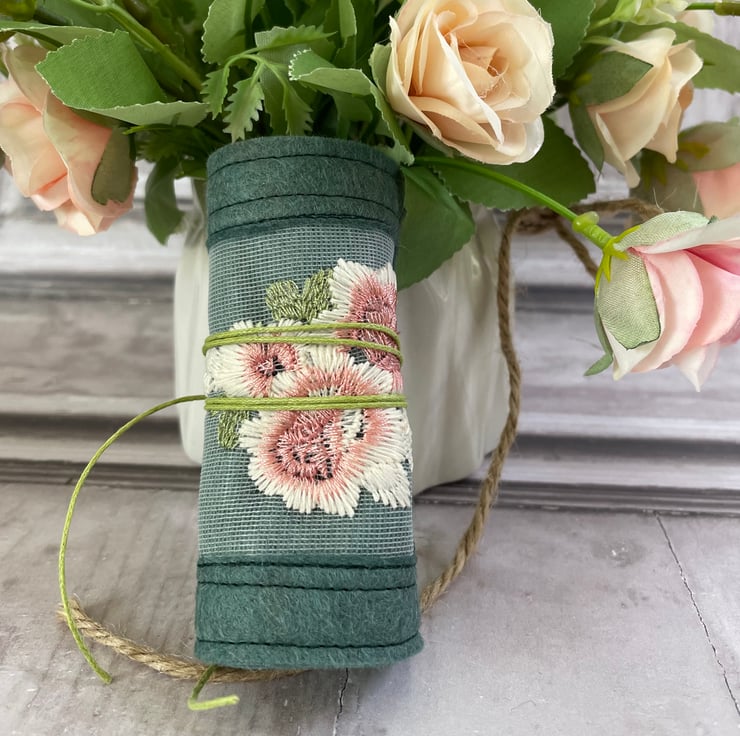 A needle roll case, to keep your needles safe. Made from 100% wool felt. Cut out displaying a pretty lace design. Tied with a waxed cord.