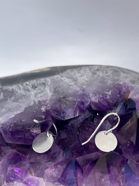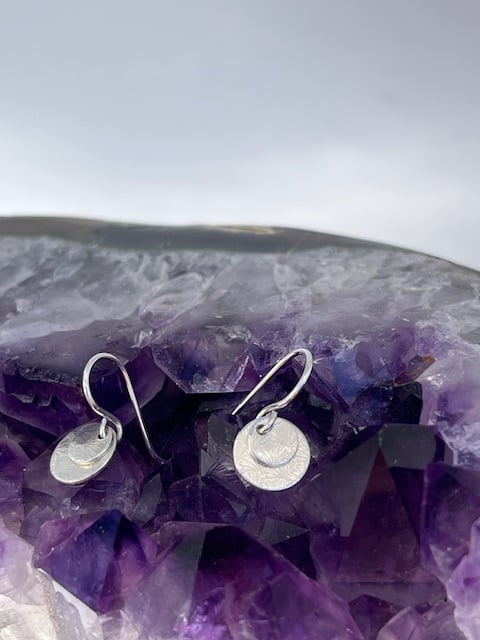 Dainty silver earrings with 2 textured disc. The larger disc is 9mm in diameter and the small is 6 mm in diameter. The earring drop is 19 mm ( including wire).