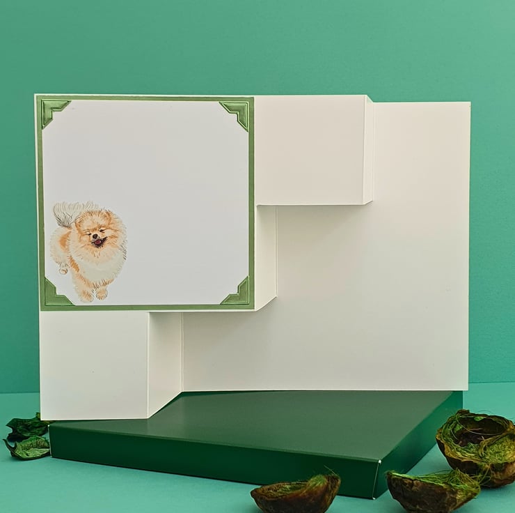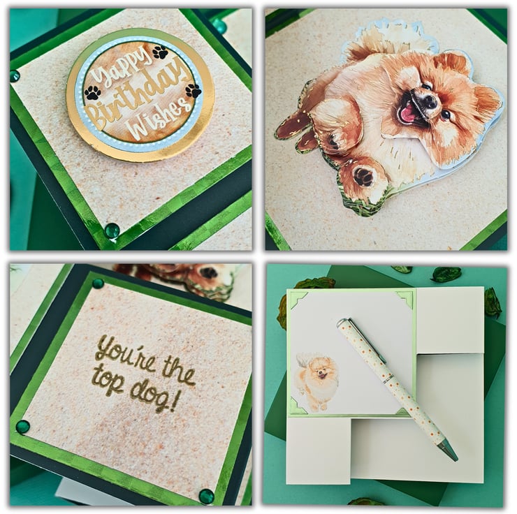 A stunning decoupaged birthday card featuring a Pomeranian dog, a perfect keepsake for a dog lover or a pet owner!