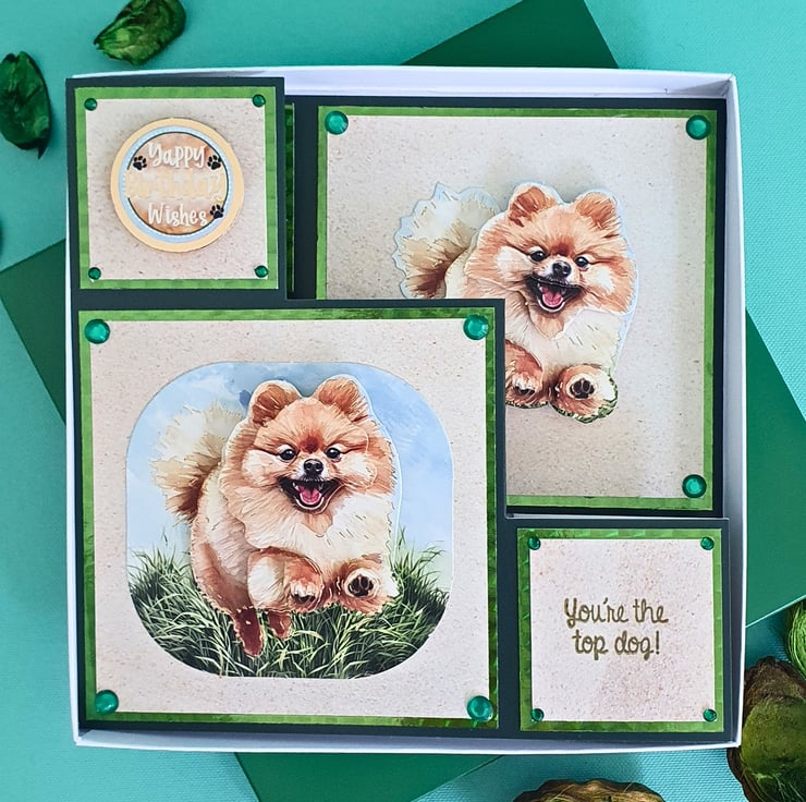 It consists of a green card base, cut in a foldback stepper shape, to create 2 large and 7 small squares. Every square is layered with green mirror card & sandy beige patterned paper. Both large squares accommodate the image of the Pomeranian dog, decoupaged with multiple layers. The wish "Yappy Birthday" decorates the top left small square, while the sentiment "You're The Top Dog" is stamped on the bottom right with green ink. The card is embellished with matching green craft gemstones. At the back, a square panel of coordinating insert will provide you with enough space to write your message and wishes.