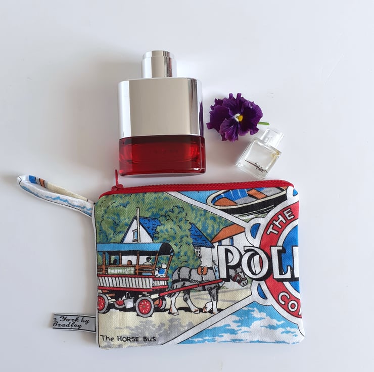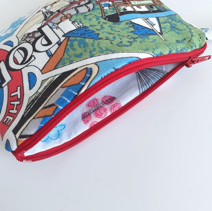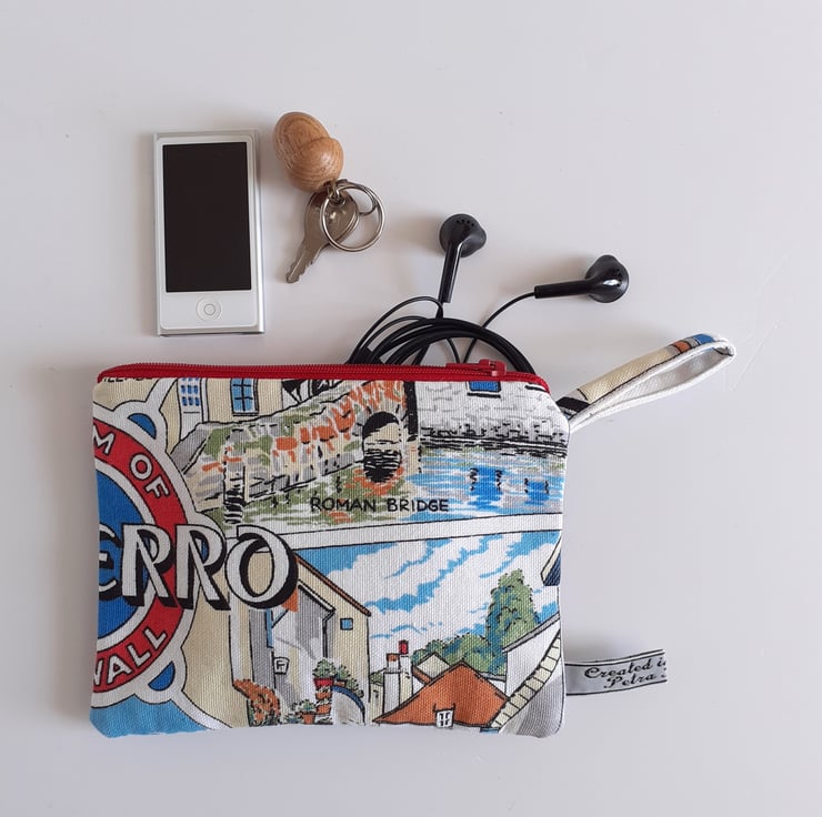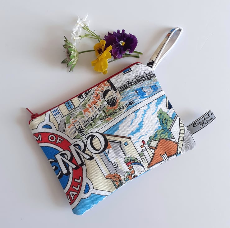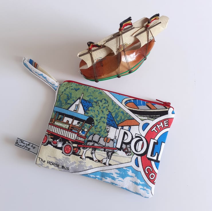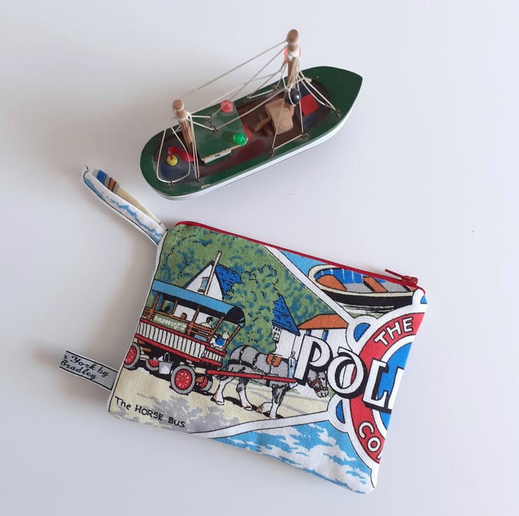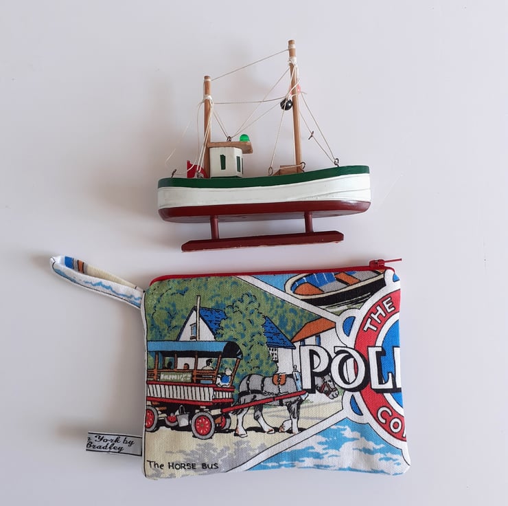 How nice to have an illustration of Cornwall on your purse, and Polperro at that! This bright tea towel featuring the horse bus no less, was perfect for creating some little pouches, storage or make up bags. This one features a lovely illustration of the Roman Bridge on the front, and the horse bus on the back. These little bags are always useful for organising your ruck sac, for storing your headphones or buds, or for your spending money! They make a great present for Dad for Fathers Day, or for anyone pining for the sea side or this part of Cornwall. There is a matching bag to this one also in my shop right now.