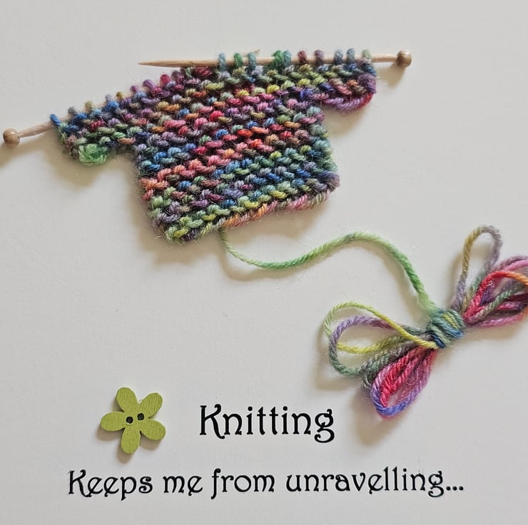 The little knitted jumper is hand knitted by myself in multicoloured yarn and transferred onto my handmade little knitting needles. The text is printed onto cream card. The picture is finished with al green wooden flower button and framed by a white mount.