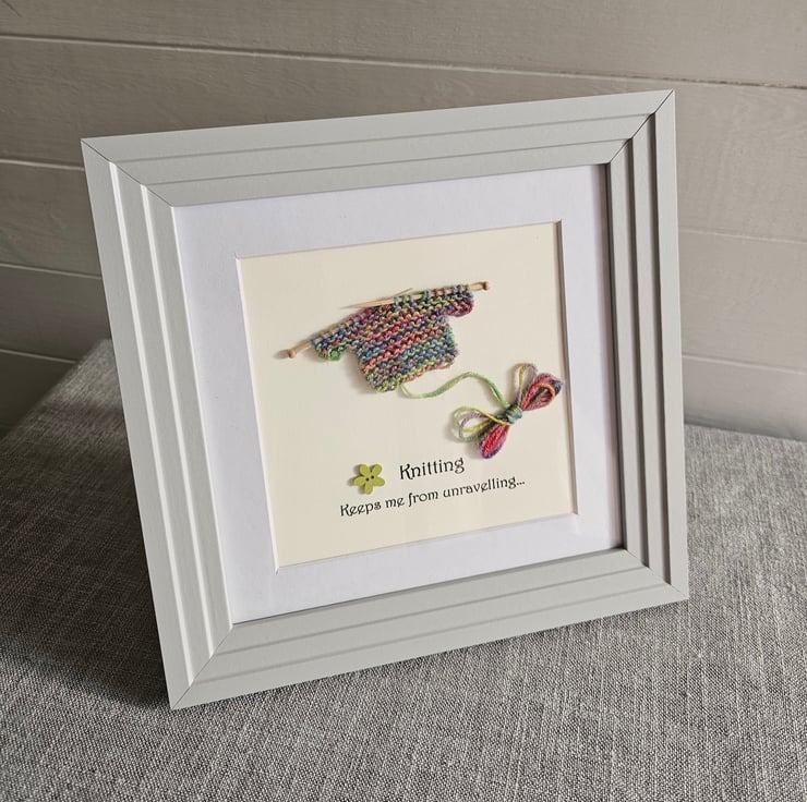 I wanted to make more items with the little knitted pieces for a wider audience. Not just babies. I love knitting and know it has become a very popular occupation/ past time again so I had the idea for this frame. Cards with the same text are also available in my shop as well as matching gift tags.