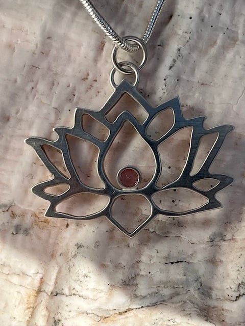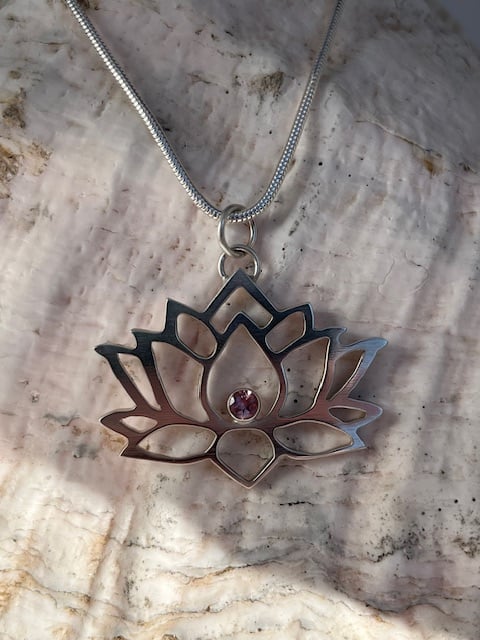 Silver lotus flower pendant with a 4 mm pink tourmaline facetted stone.