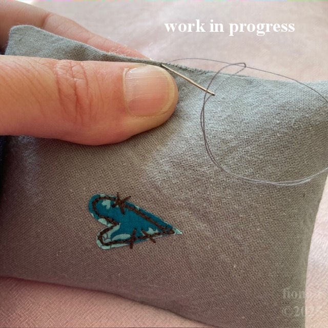 the text on the front is embroidered free hand, and there's an applique heart on the reverse.