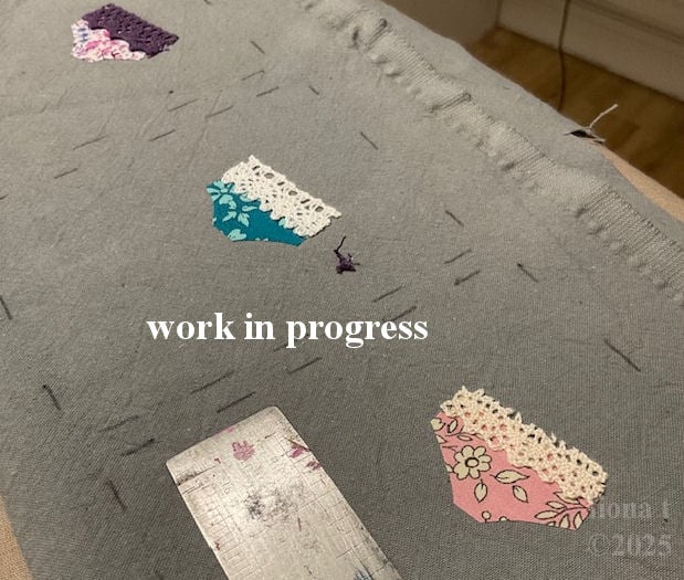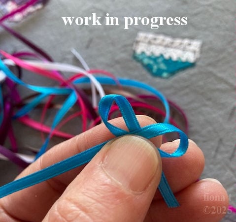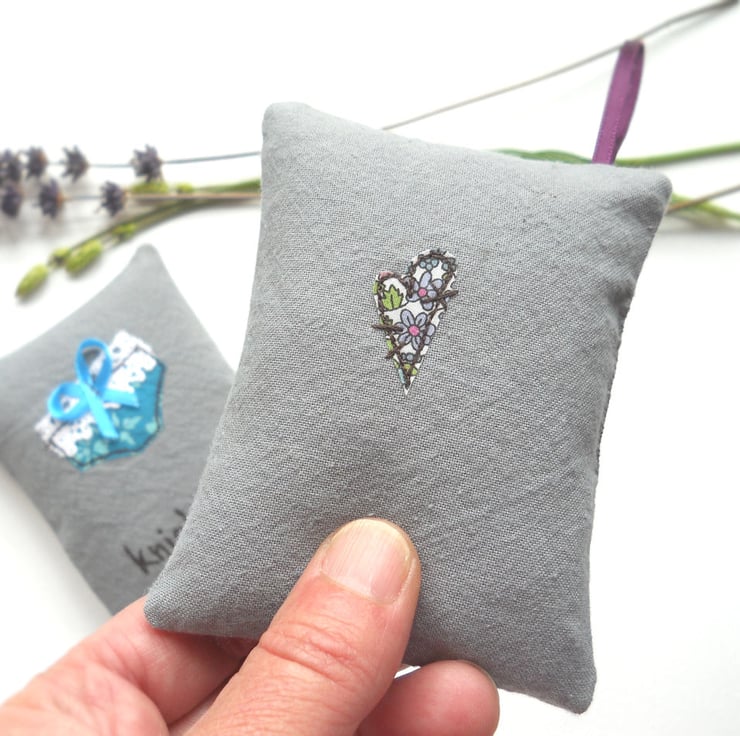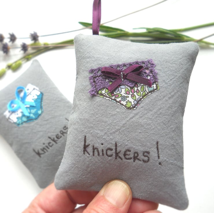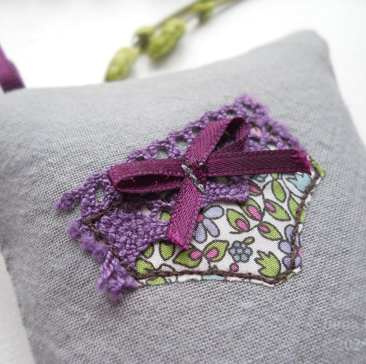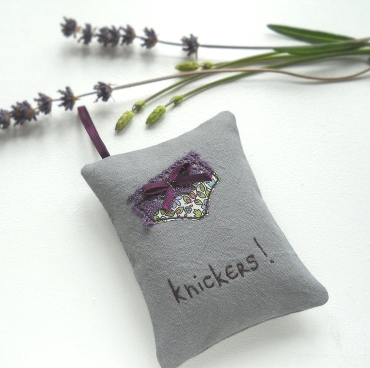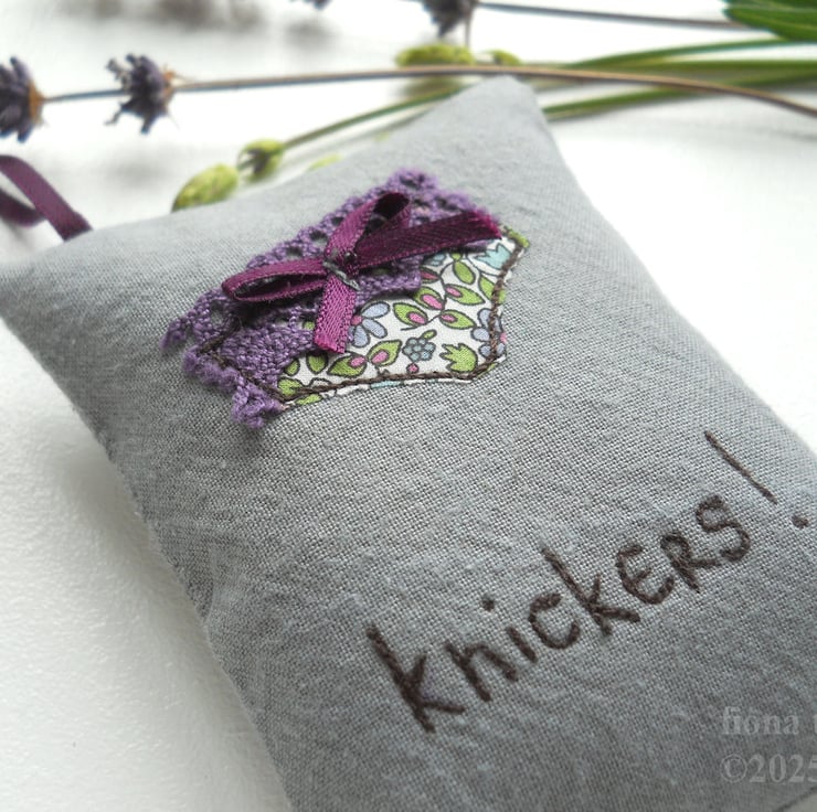 measuring 10x8cm (4x3"), this little hanging sachet features a pair of liberty print fabric undies on hand dyed grey calico base fabric. the appliqued pants are free machine embroidered and embellished with lace and a tiny ribbon bow.