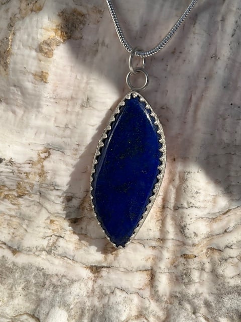 Silver lapis lazuli pendant set in gallery wire.