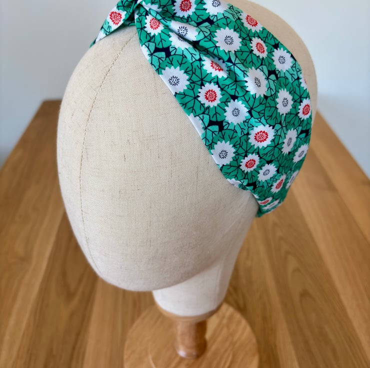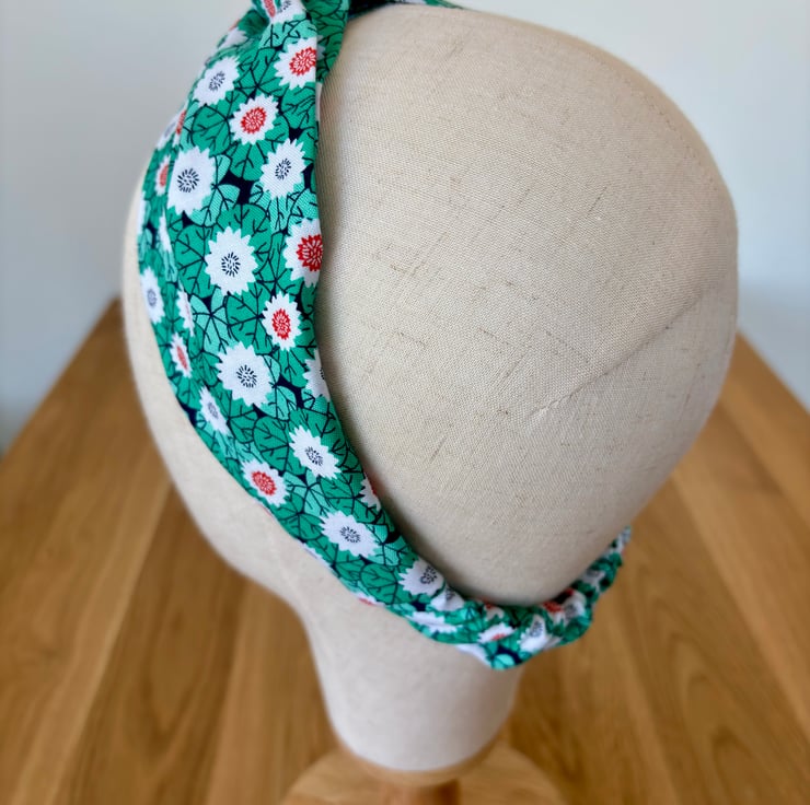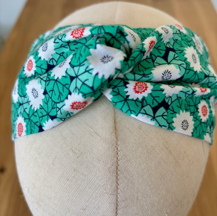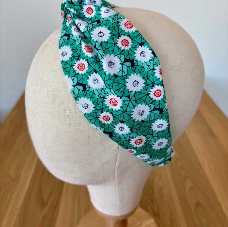 Handmade twist knot headband in soft quilting cotton, in a fabulous design of white and red lily pads on jade and navy leaves. This fabric is from a collection called “Kyoto” from designer Stuart Hillard.