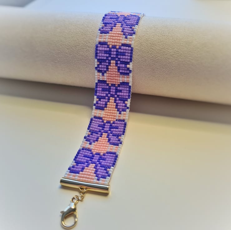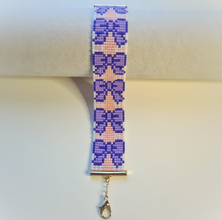 This eye catching bracelet with a cute purple Bow design was made using beautiful tiny Japanese glass beads called Miyuki Delica. There is a mix of matt and luster beads and it beautifully catches the light when worn.