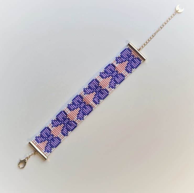The bracelet was weaved on a bead loom using strong, nylon thread. It is held together with gold plated end tubes and finished with an extender chain, lobster clasp and crescent charm. It also comes with a cute handmade pouch to store it in.