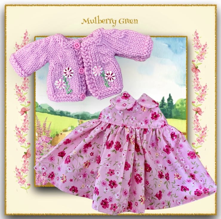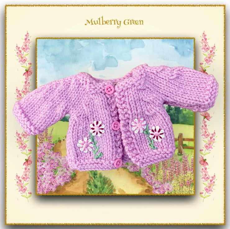 A pretty pink cardigan, embroidered with flowers, to fit the Mulberry Green characters. The cardigan is hand knitted and is finished off with three little buttons.
