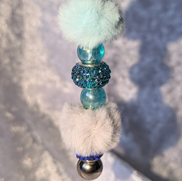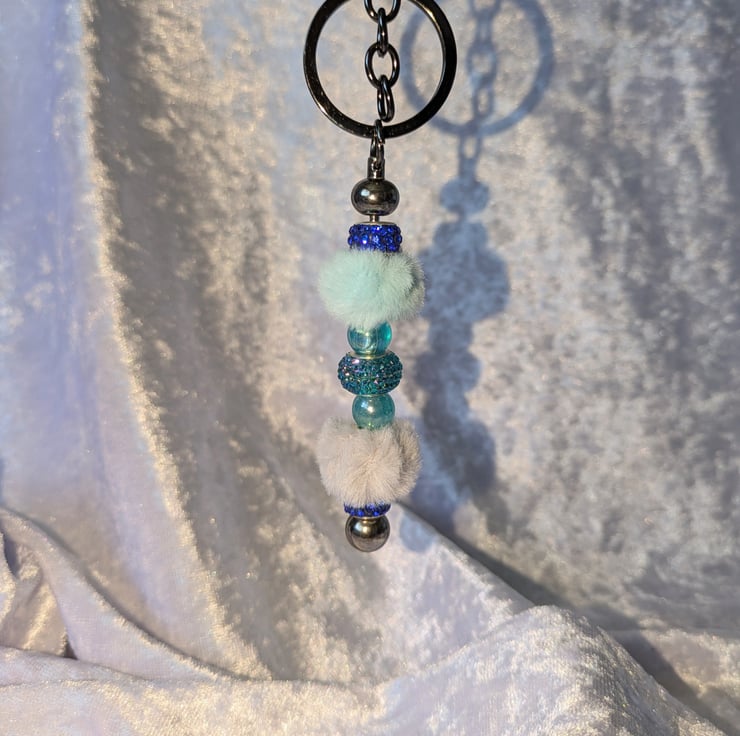 This is a black metal solid stem keyring. It has a light blue and a light grey soft faux fur fluffy bead, in the centre there is a blue aura rhinestone bead and two round blue aura beads. At each end there is a dark blue rhinestone bead. The stem length is 9cm, and the complete length is 15.3cm.