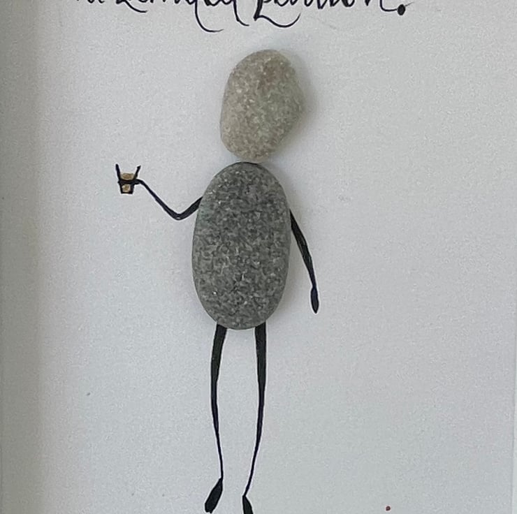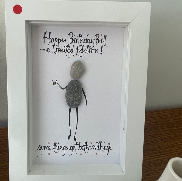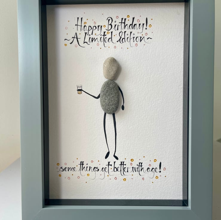 BIRTHDAY- LIMITED EDITION - BETTER WITH AGE! A unique handmade birthday gift that can be personalised. The pebble person is holding a glass of whisky (as this gets better over time too!). The message on this gift is handwritten and the person is made using pebbles picked up on beach walks around the UK. This picture comes framed in either a 10x15 cm, 8x13cm or 15x20cm which includes a mount & is only available in black or white. The frame is acrylic with glass and is available in white, black, grey or light wood effect. All frame can stand upright, lean or hang on the wall. Every pebble, piece of sea glass, shell, piece of driftwood or other natural materials are collected by us on beach walks around the UK so each piece is UNIQUE.