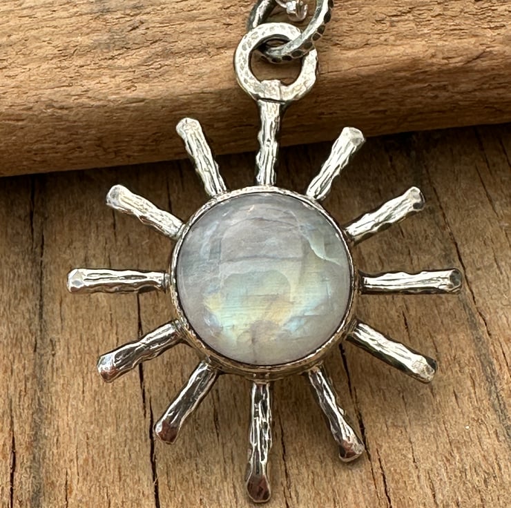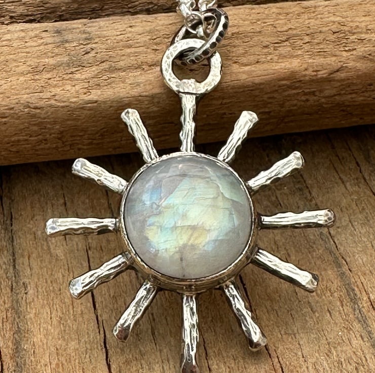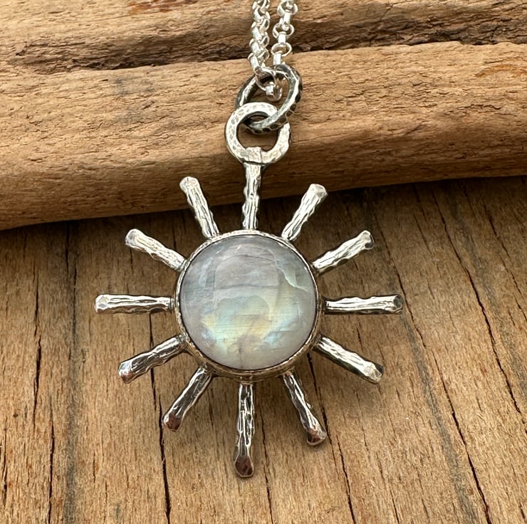 Sterling silver measuring 40 x 33mm and set with a beautiful moonstone cabochon in the centre. The moonstone is lovely and flashy, it has a little inclusion at the bottom as depicted in the photos which is natural to the stone.
