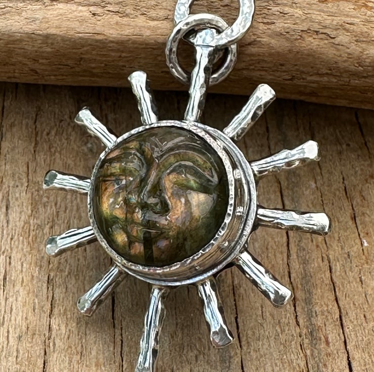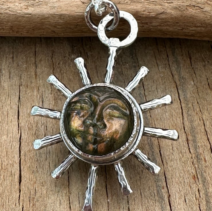 Sterling silver measuring 45 x 31mm and set with a beautiful carved labradorite face cabochon in the centre. The labradorite face has beautiful earthy green tones.