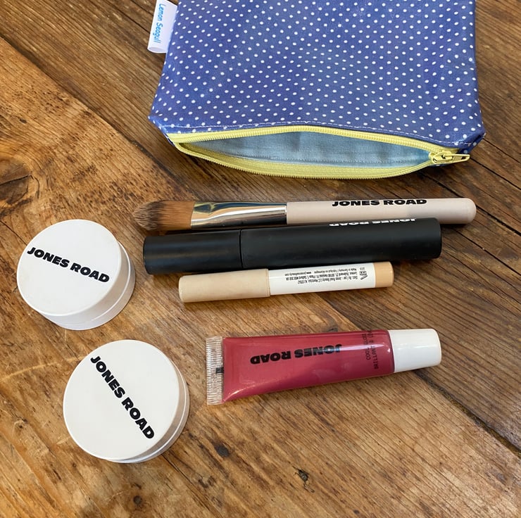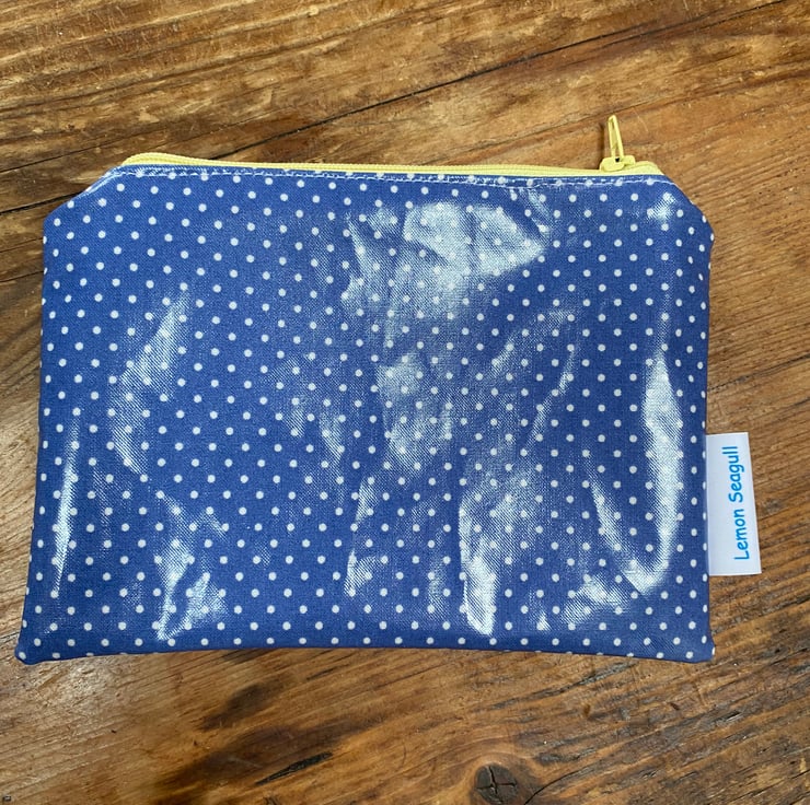 This make up bag is made from a blue oil cloth with white spots. The bag is lined with pale blue cotton fabric and a yellow zip.