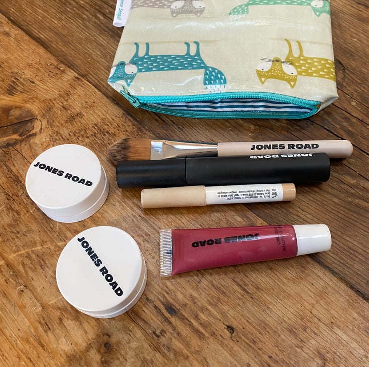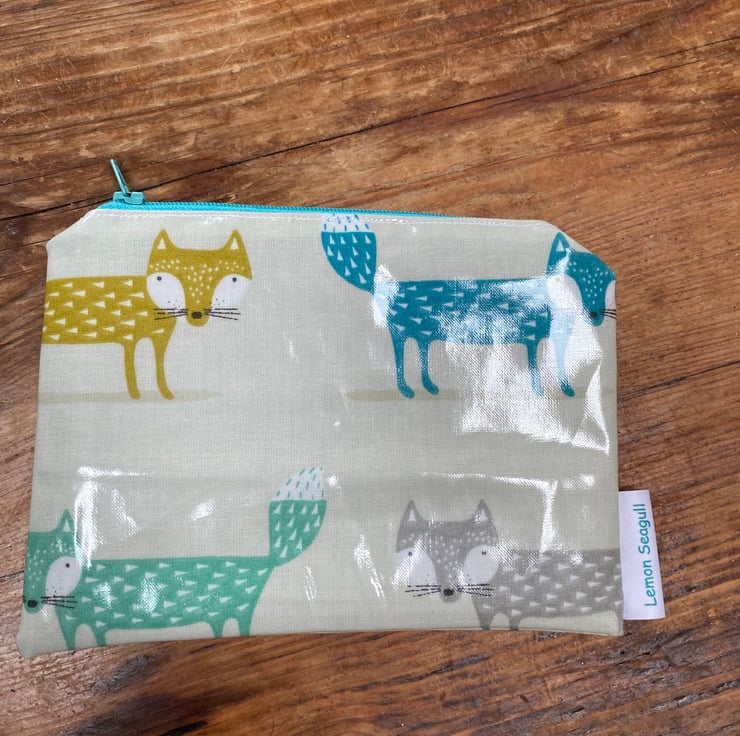 This make up bag is made from a grey oil cloth with coloured foxes. The bag is lined with teal and white striped cotton fabric and a green zip.