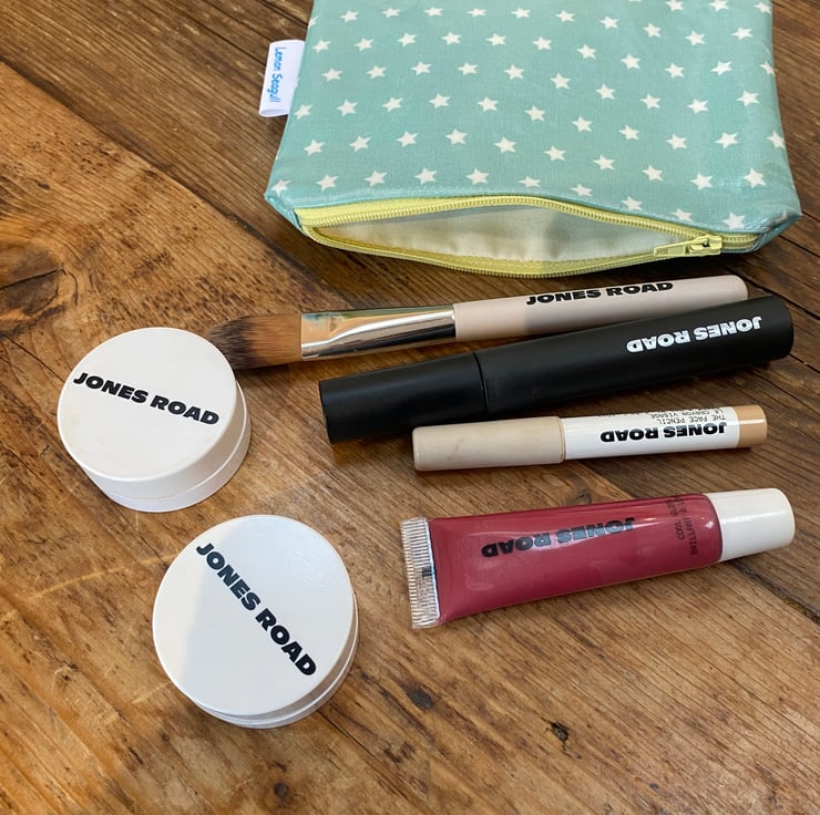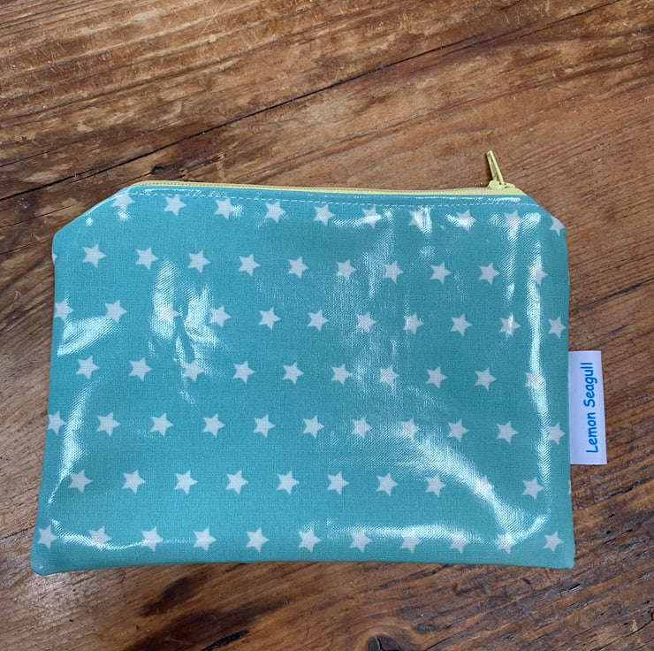 This make up bag is made from a teal oil cloth with white stars. The bag is lined with white cotton fabric and a yellow zip.