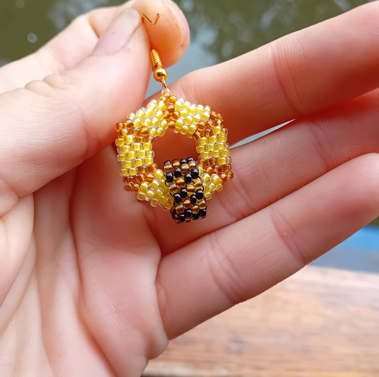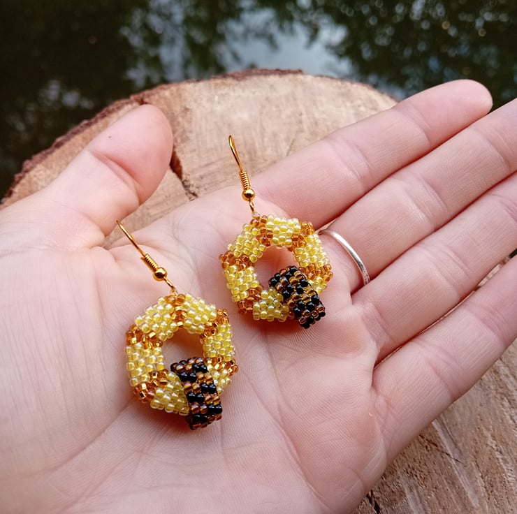 These 3D hexagon hoops are in soft honeycomb colours, pale yellow and pale gold, and are decorated with an abstract, bumblebee-esque beaded hoop. These make for a great conversation starter about saving the bees and being kind to nature and they are unique and striking (IMHO)