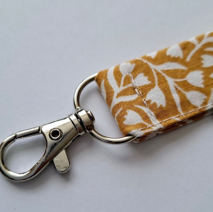 I handmade this item using cotton fabric with a mustard yellow background with creamy-white flowers.