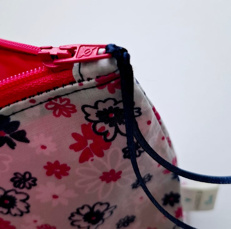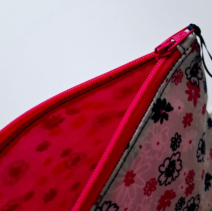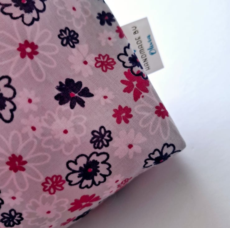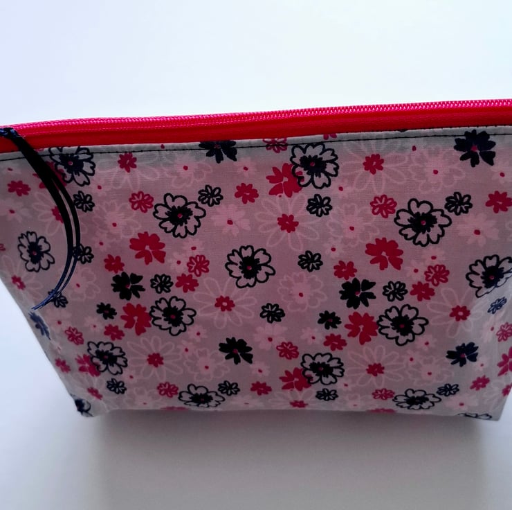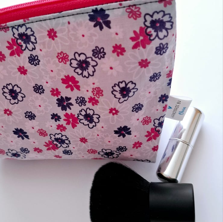 This is a lovely cosmetic bag which would make a lovely gift for someone or to treat yourself. Handmade using cotton fabric with a pale blue background, navy blue, pink and white flowers. Fully lined in pink smooth fabric. The pouch has a pink zip closure and a slim navy blue ribbon pull.