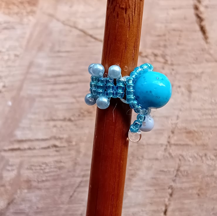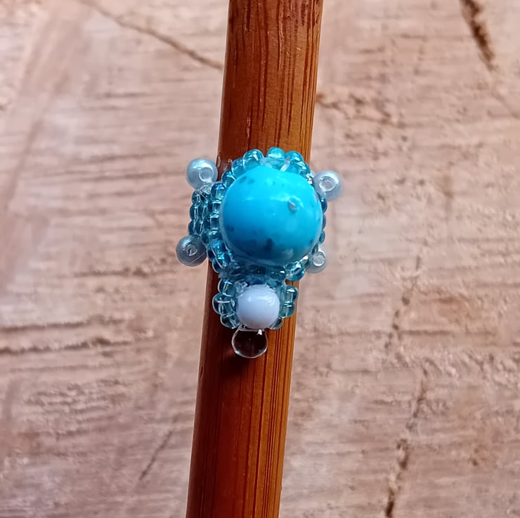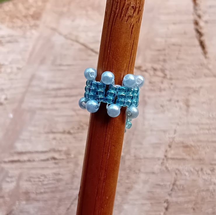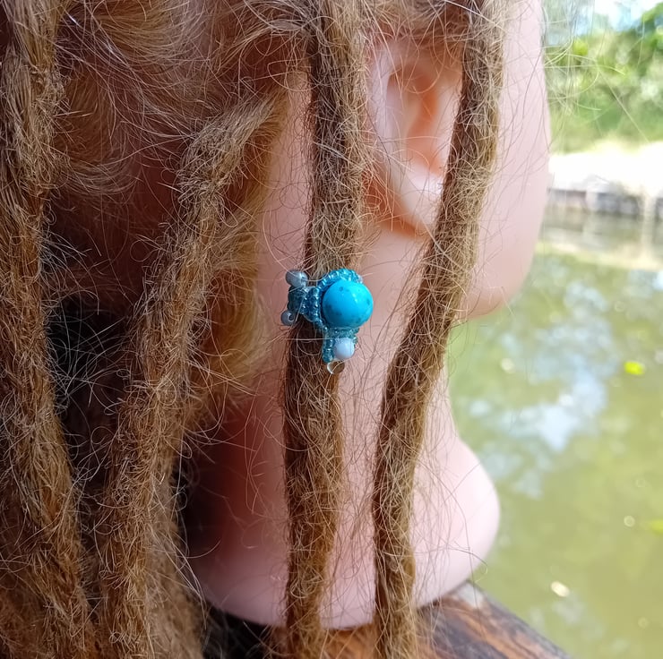 This unique dreadlock bead has been created with a blue marbled effect beads surrounded by shimmering, ice-blue seed beads, accented by a white round bead and clear dropper beads. The band is accented by turquiose-pearl round beads.