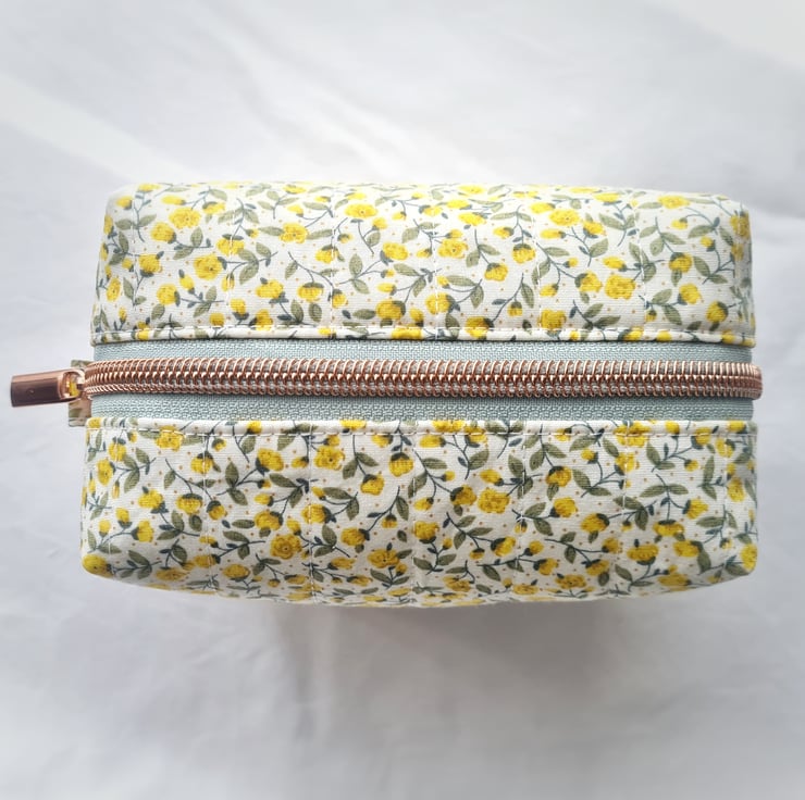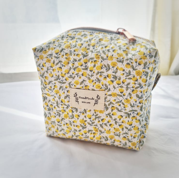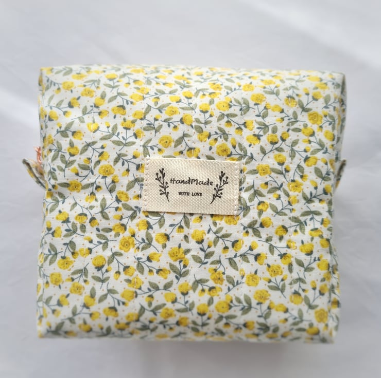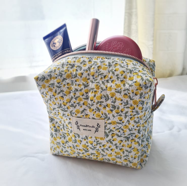 This dainty make up bag is made using high quality cotton fabric with a cute vintage floral design and is hand quilted by myself. The lining is a lilac cotton and it is finished with a rose gold zip and a cute 'Handmade' label. Perfect for make up or bits and bobs on the go!